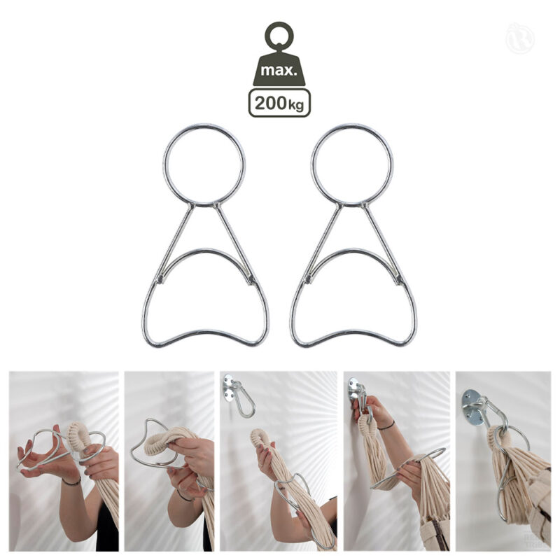 O sistema Hammock Angel é constituído por 2 acessórios de encurtamento feitos de metal galvanizado, forte e durável, garantindo uma capacidade de carga de até 200 kg.